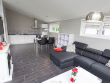 "Pavilion 6", 4 -sobni chalet 75 m2. Komforno uređen: predsoblje s odv. WC-om. Dnevni boravak/blagovaona s stolom za blagovanje i plosnatim TV ekranom. Izlaz na terasu. 3 sobe, svaka soba s 2 kreveta. Otvorena kuhinja (4 ploče za kuhanje, perilica za suđe, el. aparat za kavu, kombinirana mikrovalna pećnica). Tuš. Grijanje. Terasa. Garnitura za sjedenje. Na raspolaganju: Internet (wireless LAN [WLAN], besplatan). Parking (1 automobil) uz kuću. Dodatna informacija: kuća za nepušače. Protupožarni alarm.- postrojenja