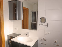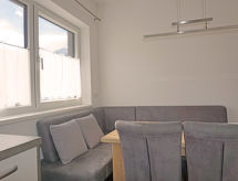 "FeWo Anna", 3 -sobni apartman 70 m2, u prizemlju. Vrlo moderno i ukusno uređen: predsoblje. 1 velika bračna soba. Izlaz na terasu. 1 mala soba s 2 kreveta (90 cm, dužina 200 cm). Velika kuhinja/dn. boravak (4 ploče za kuhanje, pećnica, perilica za suđe, toster, kuhalo za vodu, zamrzivač, el. aparat za kavu) s 1 kaučem za 2 osobe i TV-om (plosnatim TV ekranom). Izlaz na terasu, prema istoku. Tuš/WC. Grijanje. Velika terasa, prema jugu i prema istoku. Garnitura za sjedenje. Lijep pogled na planine. Parking uz kuću. Dodatna informacija: apartman za nepušače. Vlastiti ulaz.- postrojenja
