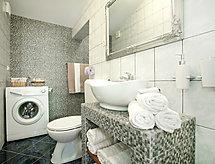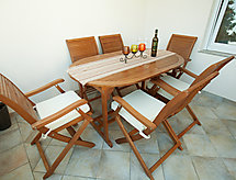 3 -sobni apartman 55 m2 na 1. katu. Lijepo i moderno uređen: dnevni boravak/blagovaona s 1 kaučem za 1 osobu, TV-om sa sat. prijemnikom i klima uređajem. Izlaz na terasu. 1 bračna soba. Izlaz na balkon. 1 soba s 2 kreveta. Kuhinjska niša (4 ploče za kuhanje, pećnica, mikrovalna pećnica, el. aparat za kavu). Tuš/WC. Klima uređaj, grijanje toplim zrakom (uz doplatu). Terasa 9 m2 (djelomično natkrita). Garnitura za sjedenje. Na raspolaganju: perilica za rublje, sef, dječji krevetić do 3 godine. Internet (wireless LAN [WLAN], besplatan). 1 kućni ljubimac / pas dozvoljen.- postrojenja
