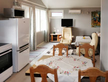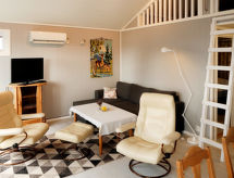 "Fjordperlen (FJS145)", 3 -sobna kuća 62 m2 na 2 etaže. Renovirana godine 2018, udobno uređena: dnevno-spavaća soba s 1 kaučem za 2 osobe, stolom za blagovanje, TV-om sa sat. prijemnikom i međunarodnim TV kanalima. Izlaz na terasu. 2 sobe, svaka soba s 1 bračnim krevetom (150 cm, dužina 200 cm). Otvorena kuhinja (4 ploče za kuhanje, toster, kuhalo za vodu, mikrovalna pećnica, zamrzivač, el. aparat za kavu). Tuš/WC. Gornji kat: s kosim stropom, otvorena galerija s 2 ležaja. Grijanje toplim zrakom, podno grijanje. Terasa. Garnitura za sjedenje, vrtni roštilj, ostava. Pogled na more. Na raspolaganju: visoka dječja stolica, dječji krevetić. Internet (wireless LAN [WLAN], besplatan). Dodatna informacija: najviše 1 kućni ljubimac / pas dozvoljen. Protupožarni alarm, vatrogasni aparat. 924531169- postrojenja