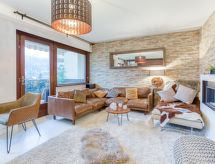 "Fleurs des alpes", 5 -sobni apartman 100 m2 na 2. katu. Prostrano, moderno uređen: dnevni boravak/blagovaona s otvorenim kaminom (samo za dekoraciju), TV-om. Izlaz na balkon. 1 soba s 1 franc. krevetom (160 cm). 1 soba s 2 kreveta. 1 soba s 1 x 1 kreveta na kat, 1 franc. krevetom. 1 soba s 1 krevetom (120 cm). Velika, otvorena kuhinja (pećnica, perilica za suđe, 4 Indukcione ploče, toster, kuhalo za vodu, zamrzivač, el. aparat za kavu, kombinirana mikrovalna pećnica). Kada/WC, tuš/WC. Električni kamin. Balkon, prema zapadu. Mjesto za sjedenje. Lijep panoramski pogled na planine. Na raspolaganju: perilica za rublje, sušilica. Internet (wireless LAN [WLAN], besplatan). Parking (natkrit, 1 automobil). Dodatna informacija: TV samo FR.- Značajke smještaja