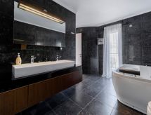 "Gem", 5 -sobna vila 250 m2 na 3 etaže. Prostrano i svijetlo, lijepo i moderno uređena: otvorena dnevno-spavaća soba s 1 kaučem za 2 osobe, otvorenim kaminom, stolom za blagovanje i TV-om sa sat. prijemnikom (plosnatim TV ekranom). Izlaz u vrt, na bazen. 1 bračna soba s 2 kreveta i tušem/WC-om. Otvorena kuhinja (pećnica, perilica za suđe, 4 staklokeramičke ploče za kuhanje, toster, kuhalo za vodu, mikrovalna pećnica, el. aparat za kavu) s malim stolom za blagovanje. Klima uređaj. Gornji kat: (stepenice bez rukohvata) 1 bračna soba s 1 bračnim krevetom, kadom/WC-om i TV-om sa sat. prijemnikom (plosnatim TV ekranom). Izlaz na balkon. 1 bračna soba s 1 x 2 kreveta na kat, tušem/WC-om i TV-om sa sat. prijemnikom (plosnatim TV ekranom). Izlaz na balkon. Klima uređaj. 2. Gornji kat: (stepenice bez rukohvata) 1 bračna soba s 1 bračnim krevetom, kadom/WC-om i TV-om sa sat. prijemnikom (plosnatim TV ekranom). Izlaz na balkon. Klima uređaj. Veliki balkon, 2 mala balkona, velika vrtna terasa (djelomično natkrita). Vrtni roštilj. Lijep pogled na more i krajolik. Na raspolaganju: perilica za rublje, glačalo, sušilo za kosu. Internet (wireless LAN [WLAN], besplatan).- Aktivnosti u blizini