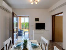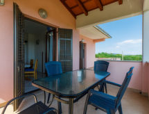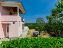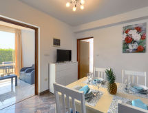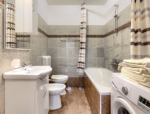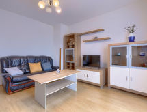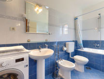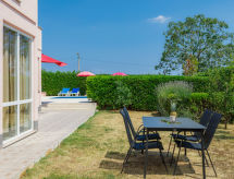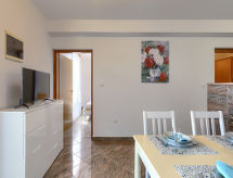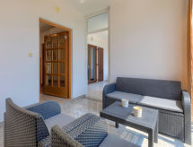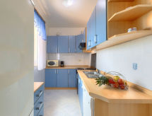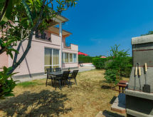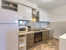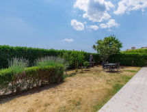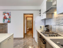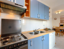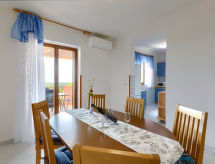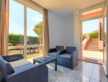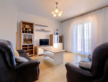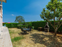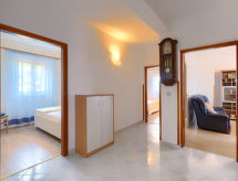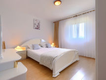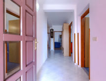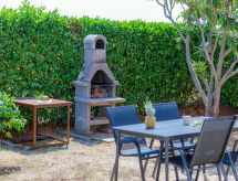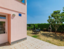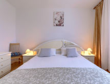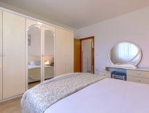 6 -sobna polovica dvojne kuće 140 m2 na 2 etaže. Blagovaona s TV-om sa sat. prijemnikom i klima uređajem. Izlaz na verandu. 1 soba s 1 franc. krevetom (160 cm, dužina 200 cm). Izlaz na verandu. 1 soba s 2 kreveta (90 cm, dužina 200 cm). Otvorena kuhinja (1 ploča za kuhanje, pećnica, perilica za suđe, 3 plamena za kuhanje, toster, kuhalo za vodu, mikrovalna pećnica, zamrzivač, el. aparat za kavu). Kada/tuš/bidet/WC. Gornji kat: (vanjske stepenice) dnevni boravak s TV-om sa sat. prijemnikom. Izlaz na terasu. Blagovaona s klima uređajem. Izlaz na terasu. 1 soba s 1 franc. krevetom (160 cm, dužina 200 cm). 1 soba s 1 franc. krevetom (180 cm, dužina 200 cm). Otvorena kuhinja (1 ploča za kuhanje, pećnica, perilica za suđe, 3 plamena za kuhanje, toster, kuhalo za vodu, mikrovalna pećnica, zamrzivač, el. aparat za kavu). Kada/tuš/bidet/WC. Terasa 14 m2 (djelomično natkrita). Garnitura za sjedenje, ležaljke. Na raspolaganju: Internet (wireless LAN [WLAN], besplatan). Dodatna informacija: kuća za nepušače.- Značajke smještaja