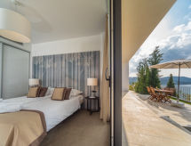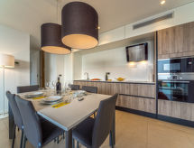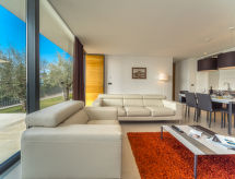 3 -sobni apartman 85 m2, u prizemlju, prema jugozapadu. Komforno i moderno uređen: dnevni boravak/blagovaona 40 m2 s TV-om sa sat. prijemnikom (plosnatim TV ekranom). Izlaz na terasu. 1 soba s 1 bračnim krevetom (2 x 90 cm, dužina 200 cm), TV-om sa sat. prijemnikom (plosnatim TV ekranom). Izlaz na terasu. 1 soba s 2 kreveta (90 cm, dužina 200 cm). Izlaz na terasu. Otvorena kuhinja (pećnica, perilica za suđe, 4 staklokeramičke ploče za kuhanje, mikrovalna pećnica, zamrzivač, el. aparat za kavu). 2 x tuš/WC. Grijanje toplim zrakom. Terasa 20 m2. Garnitura za sjedenje. Djelomičan pogled na more. Na raspolaganju: Internet (wireless LAN [WLAN], besplatan). 1 kućni ljubimac / pas dozvoljen. Apartman se nalazi na istoj parceli s vilama HR4600.203-207.- postrojenja