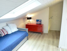 4 -sobna polovica dvojne kuće 50 m2 na 2 etaže. Komforno uređena: dnevni boravak/blagovaona s TV-om i DVD-om. Izlaz na terasu. 1 soba s 1 franc. krevetom (160 cm, dužina 200 cm). Otvorena kuhinja (pećnica, perilica za suđe, 4 staklokeramičke ploče za kuhanje, toster, kuhalo za vodu, mikrovalna pećnica, el. aparat za kavu, Doze za mašinu za kavu (Nespresso) uz doplatu). Tuš, odv. WC. El. grijanje. Gornji kat: 1 soba s kosim stropom, visina stropa 180 - 110 cm s 1 franc. krevetom (160 cm, dužina 200 cm). 1 mala soba, visina stropa 180 - 110 cm s 1 krevetom (90 cm, dužina 190 cm). Galerija, visina stropa 180 - 110 cm s 1 krevetom (90 cm, dužina 190 cm). Velika terasa 30 m2 (djelomično natkrita), prema jugu. Garnitura za sjedenje, električni roštilj, ležaljke (2). Na raspolaganju: perilica za rublje, sušilica. Internet (wireless LAN [WLAN], besplatan). Parking br. 25. Dodatna informacija: protupožarni alarm.- Značajke smještaja
