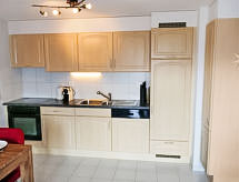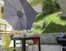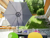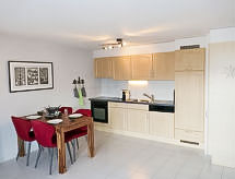 "Grand Panorama A 01", 2 -sobni apartman 55 m2 na 1. katu, prema sjeveru. Svijetlo, komforno i lijepo uređen: dnevni boravak/blagovaona s panoramskim prozorom s 1 kaučem za 2 osobe (160 cm, dužina 200 cm), kabelskom TV, CD-om, DVD-om i zbirkom DVD-a na raspolaganju. Izlaz na terasu, prema sjeveru i prema sjeveroistoku. 1 soba s 1 franc. krevetom (160 cm, dužina 200 cm). Otvorena kuhinja (pećnica, perilica za suđe, 4 staklokeramičke ploče za kuhanje, el. aparat za kavu, Doze za mašinu za kavu (nespresso), raclette roštilj, set za fondue (chinoise)). Tuš/WC. Garnitura za sjedenje. Vrlo lijep pogled na planine. Na raspolaganju: sušilo za kosu. Internet (wireless LAN [WLAN], besplatan). Parking br. A 1 (2 automobila). Dodatna informacija: prikladno za obitelji. Apartman za nepušače.- postrojenja
