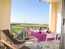 2 -sobni apartman 28 m2 na 1. katu. Svrsishodno i lijepo uređen: dnevni boravak/blagovaona s 1 kaučem za 2 osobe (1 x 140 cm), TV-om (plosnatim TV ekranom). Izlaz na balkon. 1 mala soba 9 m2 s 1 franc. krevetom (1 x 140 cm). Kuhinjska niša (mini pećnica, perilica za suđe, 4 staklokeramičke ploče za kuhanje). Kada/WC. Balkon 8 m2. Balkonski namještaj. Pogled na more. Na raspolaganju: perilica za rublje. Internet (wireless LAN [WLAN], uz doplatu). Dodatna informacija: bez parkinga. Najviše 1 kućni ljubimac / pas dozvoljen. TV samo FR. Protupožarni alarm.- Značajke smještaja