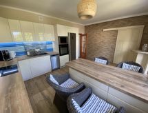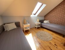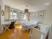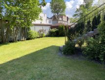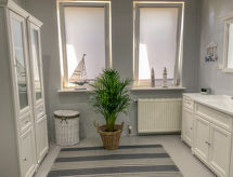 "Hamptons", 8 -sobna kuća 220 m2 na 3 etaže. Djelomično spušten strop, svrsishodno i moderno uređena: dnevni boravak/blagovaona s 1 kaučem za 1 osobu, TV-om sa sat. prijemnikom, videom i DVD-om. Izlaz u vrt, na terasu. (pećnica, perilica za suđe, 4 staklokeramičke ploče za kuhanje, mikrovalna pećnica, zamrzivač, gril) s stolom za blagovanje. Tuš/WC. Grijanje na plin. Gornji kat: 1 soba s 1 franc. krevetom. 1 soba s 1 franc. krevetom. 1 soba s 1 franc. krevetom. 1 soba s 2 kreveta i 1 kaučem za 1 osobu. Tuš/WC. Grijanje na plin. 2. Gornji kat: 1 soba s kosim stropom s 2 kreveta. 1 soba s kosim stropom s 2 kreveta. Soba za igru s 1 kaučem za 1 osobu i TV-om sa sat. prijemnikom. Balkon 6 m2, 2 terase 12 m2. Garnitura za sjedenje, mjesto za sjedenje. Na raspolaganju: Internet (wireless LAN [WLAN]). Parking uz kuću.- postrojenja