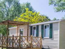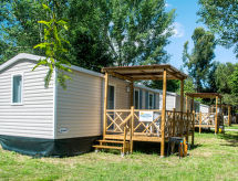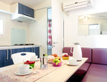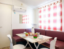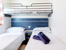 "Happy Standard", 3 -sobna mobilna kućica 25 m2. Svrsishodno uređena: dnevni boravak/blagovaona s el. grijanjem i klima uređajem. 1 soba s 1 franc. krevetom (140 cm, dužina 190 cm). 1 soba s 2 kreveta (70 cm, dužina 190 cm), 1 x 1 kreveta na kat (65 cm, dužina 179 cm). Otvorena kuhinja (4 ploče za kuhanje). Tuš/WC. Klima uređaj (uz doplatu). Terasa (djelomično natkrita). Garnitura za sjedenje, električni roštilj (prijenosni), ležaljke (2). Na raspolaganju: mrežice protiv komaraca. Parking (1 automobil) uz kuću. Dodatna informacija: apartman za nepušače. Raspored kreveta je fleksibilan. Dostupno je više mogućnosti za spavanje od maksimalno dopuštenog broja osoba koji se ipak ne smije prekoračiti- postrojenja