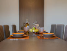 "Helianthos", 5 -sobna vila 147 m2 na 3 etaže. Prostrano i svijetlo, komforno i moderno uređena: otvoreni dnevni boravak s otvorenim kaminom i TV-om sa sat. prijemnikom (plosnatim TV ekranom), radiom. Izlaz u vrt, na bazen. 1 bračna soba s 1 bračnim krevetom, tušem/WC-om i TV-om sa sat. prijemnikom (plosnatim TV ekranom). Izlaz u vrt. Otvorena kuhinja (pećnica, perilica za suđe, 4 staklokeramičke ploče za kuhanje, mikrovalna pećnica, el. aparat za kavu) s stolom za blagovanje. Klima uređaj. Donji kat: (stepenice bez rukohvata) 1 soba s hidromasažnim tušem. Gornji kat: (stepenice bez rukohvata) 1 bračna soba s 1 bračnim krevetom, tušem/WC-om i TV-om sa sat. prijemnikom (plosnatim TV ekranom). Izlaz na balkon. 1 bračna soba s 2 kreveta, tušem/WC-om i TV-om sa sat. prijemnikom (plosnatim TV ekranom). Izlaz na balkon. Klima uređaj. 2 balkona. Vrtni roštilj. Lijep pogled na more. Na raspolaganju: perilica za rublje, sušilica, sef, glačalo, sušilo za kosu. Internet (wireless LAN [WLAN], besplatan). Dodatna informacija: prikladno za obitelji. Kuća za nepušače. 1041 K910 0315 7801- postrojenja