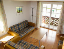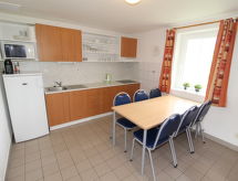 4 -sobna kuća 100 m2 na 2 etaže. Svijetlo, komforno i udobno uređena: otvoreni dnevni boravak s TV-om sa sat. prijemnikom. Izlaz na terasu. Kuhinja (4 ploče za kuhanje, kuhalo za vodu, mikrovalna pećnica, zamrzivač) s stolom za blagovanje. Odv. WC. Gornji kat: 3 sobe, svaka soba s 2 kreveta. Kada/WC. Mala terasa. Garnitura za sjedenje. Na raspolaganju: perilica za rublje, dječji krevetić. Internet (wireless LAN [WLAN], besplatan). Dodatna informacija: prikladno za obitelji. Kuća za nepušače.- postrojenja