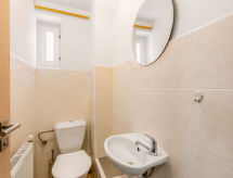 4 -sobna kuća 100 m2 na 2 etaže. Svijetlo, komforno i udobno uređena: otvoreni dnevni boravak s TV-om sa sat. prijemnikom (plosnatim TV ekranom). Izlaz na terasu. Kuhinja (pećnica, perilica za suđe, 4 staklokeramičke ploče za kuhanje, kuhalo za vodu, mikrovalna pećnica, zamrzivač) s stolom za blagovanje. Odv. WC. Gornji kat: 3 sobe, svaka soba s 2 kreveta. Kada/WC. Velika terasa 14 m2. Garnitura za sjedenje, vrtni roštilj (prijenosni). Na raspolaganju: perilica za rublje, dječji krevetić. Internet (wireless LAN [WLAN], besplatan). Dodatna informacija: prikladno za obitelji. Kuća za nepušače. 2 kućna ljubimca / psa dozvoljena.- postrojenja