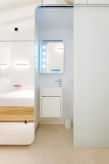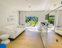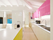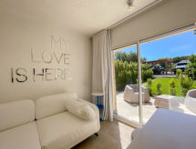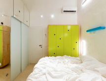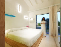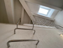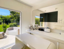 "House Boat Large", 4 -sobna kuća u nizu 75 m2, u prizemlju. Svijetlo, vrlo moderno i stilski uređena: dnevni boravak/blagovaona s 2 kauča za 1 osobu, stolom za blagovanje i TV-om sa sat. prijemnikom. Izlaz na terasu. 1 bračna soba s kliznim vratima s umivaonikom i odv. WC-om. Izlaz na terasu. 1 mala soba s krovnim prozorom s 1 x 2 kreveta na kat. Dnevno-spavaća soba s 1 kaučem za 2 osobe, stolom za blagovanje, kuhinjskim blokom i TV-om sa sat. prijemnikom. Izlaz na terasu. Otvorena kuhinja (pećnica, perilica za suđe, 4 Indukcione ploče, toster, zamrzivač). 2 x tuš/WC. El. grijanje, klima uređaj. Terasa (djelomično natkrita), vrt, travnjak. Garnitura za sjedenje, vrtni roštilj (prijenosni). Na raspolaganju: perilica za rublje, sušilica. Parking (2 automobila). Dodatna informacija: apartman za nepušače.- postrojenja