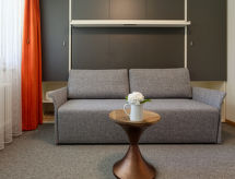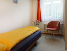 2 -sobni apartman 30 m2, u prizemlju, prema jugozapadu. Jednostavno i udobno uređen: dnevno-spavaća soba s 1 rasklopni zidni krevet za 2 osobe (1 x 160 cm, dužina 200 cm), TV-om i radiom. 1 soba s 1 krevetom (90 cm, dužina 200 cm). Otvorena kuhinja (3 ploče za kuhanje, pećnica, kuhalo za vodu, mikrovalna pećnica, zamrzivač, el. aparat za kavu). Tuš/WC. Grijanje. Mala terasa, prema jugu. Garnitura za sjedenje. Bočni pogled na planine. Na raspolaganju: Internet (wireless LAN [WLAN]). Dodatna informacija: apartman za nepušače.- postrojenja