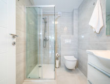 2 -sobni apartman 45 m2, u prizemlju, prema sjeverozapadu. Dnevni boravak/blagovaona 25 m2 s 1 kaučem za 2 osobe (140 cm, dužina 200 cm), TV-om sa sat. prijemnikom (plosnatim TV ekranom), klima uređajem. Izlaz na terasu. 1 soba s 1 franc. krevetom (160 cm, dužina 200 cm), TV-om sa sat. prijemnikom. Otvorena kuhinja (pećnica, perilica za suđe, 4 staklokeramičke ploče za kuhanje, mikrovalna pećnica, zamrzivač, el. aparat za kavu). Tuš/WC. Terasa 16 m2 (natkrita). Garnitura za sjedenje. Pogled na bazen. Na raspolaganju: sef, sušilo za kosu. Internet (wireless LAN [WLAN], besplatan).- postrojenja