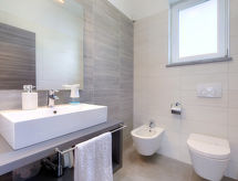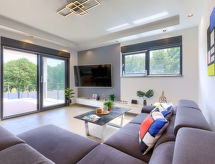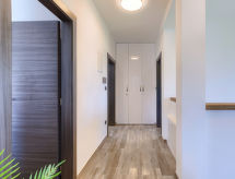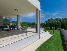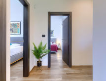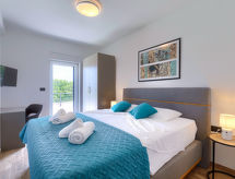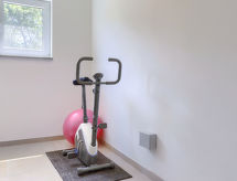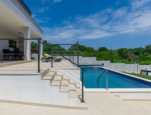 5 -sobna vila 200 m2 na 2 etaže. Dnevni boravak/blagovaona s TV-om sa sat. prijemnikom i klima uređajem. Izlaz na terasu. Otvorena kuhinja (pećnica, perilica za suđe, 4 staklokeramičke ploče za kuhanje, kuhalo za vodu, mikrovalna pećnica, zamrzivač, el. aparat za kavu). Odv. WC. Gornji kat: 1 soba s 2 kreveta (90 cm, dužina 200 cm), TV-om sa sat. prijemnikom i klima uređajem. 2 sobe, svaka soba s 1 franc. krevetom (180 cm, dužina 200 cm), TV-om sa sat. prijemnikom i klima uređajem. 1 soba s 1 franc. krevetom (180 cm, dužina 200 cm), tušem/WC-om, TV-om sa sat. prijemnikom i klima uređajem. Izlaz na terasu. Kada/tuš/WC. Grijanje toplim zrakom. Terasa 50 m2 (djelomično natkrita), terasa 5 m2. Garnitura za sjedenje, vrtni roštilj (prijenosni), ležaljke. Pogled na bazen i vrt. Na raspolaganju: sef, visoka dječja stolica, dječji krevetić, sušilo za kosu. Internet (wireless LAN [WLAN], besplatan).- postrojenja