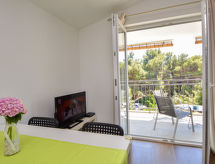 2 -sobni apartman 40 m2 na 2. katu, prema jugozapadu. Dnevni boravak/blagovaona s 1 kaučem za 2 osobe (160 cm, dužina 200 cm), TV-om sa sat. prijemnikom (plosnatim TV ekranom), klima uređajem. Izlaz na terasu. 1 soba s 1 franc. krevetom (160 cm, dužina 200 cm). Otvorena kuhinja (2 staklokeramičke ploče za kuhanje, mikrovalna pećnica, zamrzivač, el. aparat za kavu). Tuš/WC. Klima uređaj (uz doplatu). Terasa 12 m2 (natkrita). Garnitura za sjedenje. Na raspolaganju: sušilo za kosu. Internet (wireless LAN [WLAN], besplatan).- postrojenja