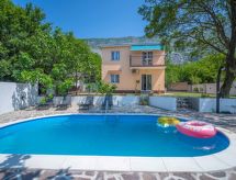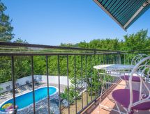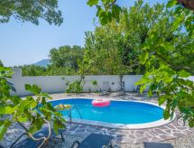 5 -sobna kuća 120 m2 na 2 etaže. Dnevni boravak/blagovaona 26 m2 s kabelskom TV (plosnatim TV ekranom), klima uređajem. 1 soba s 1 bračnim krevetom (2 x 90 cm, dužina 200 cm). Otvorena kuhinja (4 ploče za kuhanje, pećnica, perilica za suđe, el. aparat za kavu). Tuš/bidet/WC. Gornji kat: predsoblje s klima uređajem. 1 soba s 1 bračnim krevetom (2 x 90 cm, dužina 200 cm). Izlaz na balkon. 1 soba s 2 kreveta (90 cm, dužina 200 cm). 1 soba s 1 franc. krevetom (160 cm, dužina 200 cm), tušem/WC-om. Tuš/WC. Balkon 5 m2, terasa 13 m2 (natkrita). Balkonski namještaj, vrtni roštilj (prijenosni), ležaljke. Pogled na bazen. Na raspolaganju: Internet (wireless LAN [WLAN], besplatan). 1 kućni ljubimac / pas dozvoljen.- postrojenja