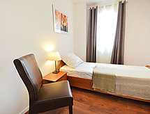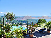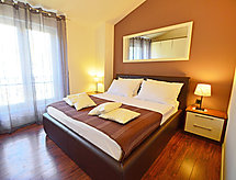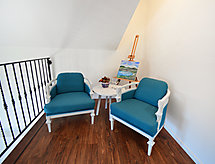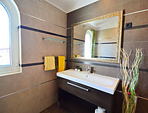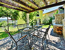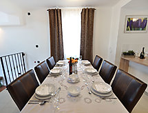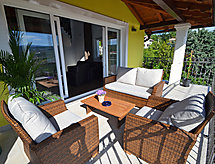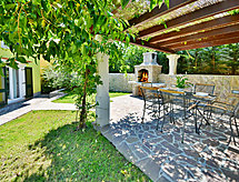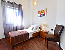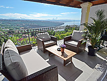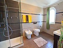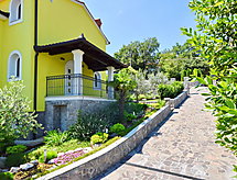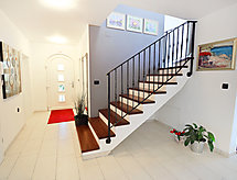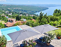 5 -sobna vila 140 m2 na 2 etaže, prema istoku. Veliki dnevni boravak/blagovaona 75 m2, na 2 nivoa s otvorenim kaminom i kabelskom TV (plosnatim TV ekranom), klima uređajem. Izlaz na terasu. 1 soba s 1 krevetom (90 cm, dužina 190 cm). Otvorena kuhinja (4 ploče za kuhanje, pećnica, perilica za suđe, zamrzivač, el. aparat za kavu). Tuš/WC. Gornji kat: 1 soba s 1 krevetom (90 cm, dužina 200 cm). 2 sobe, svaka soba s 1 franc. krevetom (160 cm, dužina 200 cm), TV-om sa sat. prijemnikom (plosnatim TV ekranom), klima uređajem. Tuš/bidet/WC. Terasa 18 m2 (natkrita). Garnitura za sjedenje, ležaljke (6). Prekrasan panoramski pogled na more i krajolik. Na raspolaganju: glačalo. Internet (wireless LAN [WLAN], besplatan).- postrojenja