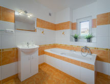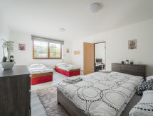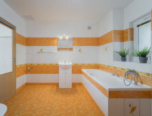 "Jana", 2 -sobni apartman 90 m2, u prizemlju. Svijetlo, moderno i udobno uređen: povezna soba s 1 kaučem za 1 osobu, 1 bračnim krevetom i TV-om sa sat. prijemnikom. 1 soba s 2 kreveta i 1 bračnim krevetom. Kuhinja (4 ploče za kuhanje, pećnica, perilica za suđe, toster, kuhalo za vodu, mikrovalna pećnica, zamrzivač, el. aparat za kavu) s stolom za blagovanje. Kada/tuš/WC. Grijanje. Na raspolaganju: Internet (wireless LAN [WLAN], besplatan). Dodatna informacija: apartman za nepušače. Vlastiti ulaz.- Značajke smještaja