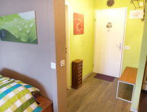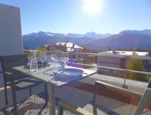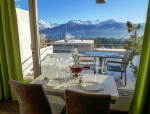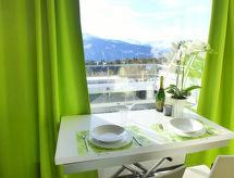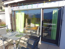 1 -sobni apartman 33 m2 na 3. katu. Komforno uređen: dnevno-spavaća soba s 1 franc. krevetom (160 cm, dužina 200 cm), kabelskom TV i radiom. Otvorena kuhinja (3 ploče za kuhanje, pećnica, toster, kuhalo za vodu, mikrovalna pećnica, el. aparat za kavu, Doze za mašinu za kavu (NESPRESSO) uz doplatu, raclette roštilj, set za fondue (sir)). Kada/WC. Balkon 7 m2, prema jugu. Balkonski namještaj, ostava. Vrlo lijep pogled na planine i dolinu. Na raspolaganju: sušilo za kosu. Internet (wireless LAN [WLAN], besplatan). Dodatna informacija: apartman za nepušače. 1 kućni ljubimac / pas dozvoljen.- Značajke smještaja
