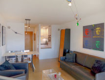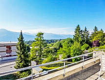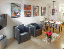 3 -sobni apartman 59 m2 na 2. katu, prema jugu. Djelomično renoviran godine 2022, komforno i lijepo uređen: dnevni boravak/blagovaona s 1 kaučem za 1 osobu (160 cm, dužina 190 cm), stolom za blagovanje, kabelskom TV, plosnatim TV ekranom i DVD-om. Izlaz na terasu, prema jugu. 1 soba s 2 kreveta (90 cm, dužina 190 cm). 1 soba s 2 kreveta (90 cm, dužina 200 cm). Izlaz na terasu. Mala, otvorena kuhinja (pećnica, perilica za suđe, 4 staklokeramičke ploče za kuhanje, toster, kuhalo za vodu, el. aparat za kavu, Doze za mašinu za kavu (Nespresso) uz doplatu, raclette roštilj, kombinirana mikrovalna pećnica, set za fondue (sir)). Tuš/WC. Terasa 15 m2, prema jugu. Garnitura za sjedenje, ležaljke (2). Vrlo lijep pogled na planine. Na raspolaganju: glačalo, visoka dječja stolica, dječji krevetić do 2 godine, sušilo za kosu. Internet (wireless LAN [WLAN], besplatan). Dodatna informacija: apartman za nepušače. 1 kućni ljubimac / pas dozvoljen.- Značajke smještaja