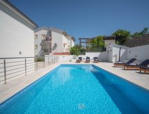 3 -sobni apartman 55 m2 na 1. katu, prema jugu. Dnevni boravak/blagovaona s TV-om sa sat. prijemnikom (plosnatim TV ekranom), klima uređajem. Izlaz na balkon. 1 soba s 1 bračnim krevetom (2 x 90 cm, dužina 200 cm). 1 soba s 1 franc. krevetom (140 cm, dužina 200 cm). Otvorena kuhinja (2 ploče za kuhanje, perilica za suđe). Tuš/WC. Grijanje toplim zrakom. Balkon 12 m2. Balkonski namještaj. Lijep pogled na more. Na raspolaganju: Internet (wireless LAN [WLAN], besplatan).- postrojenja