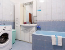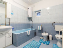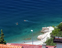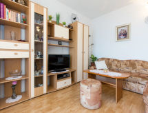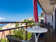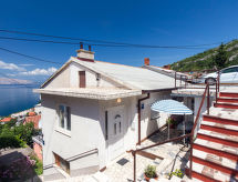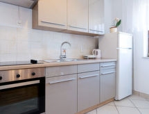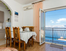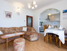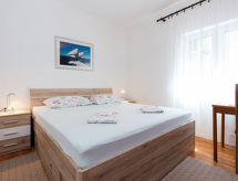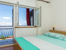 3 -sobni apartman 70 m2 na 1. katu. Dnevni boravak/blagovaona s TV-om sa sat. prijemnikom i klima uređajem. Izlaz na balkon. 1 soba s 1 bračnim krevetom (2 x 90 cm, dužina 200 cm). 1 soba s 1 krevetom (90 cm, dužina 190 cm), 1 bračnim krevetom (2 x 90 cm, dužina 190 cm). Izlaz na balkon. Otvorena kuhinja (4 Indukcione ploče, toster, kuhalo za vodu, zamrzivač, el. aparat za kavu). Kada/WC. Klima uređaj (uz doplatu). Parketni pod. Balkon 12 m2. Balkonski namještaj, ležaljke (2). Pogled na more. Na raspolaganju: perilica za rublje, glačalo. Internet (wireless LAN [WLAN], besplatan).- postrojenja