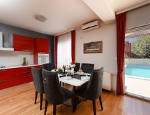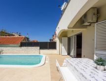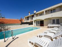 5 -sobna kuća u nizu 160 m2 na 2 etaže, prema jugozapadu. Dnevni boravak/blagovaona 42 m2 s TV-om (plosnatim TV ekranom), klima uređajem. Izlaz na terasu. 1 soba s 1 franc. krevetom (160 cm, dužina 200 cm). Otvorena kuhinja (4 ploče za kuhanje, pećnica, perilica za suđe, zamrzivač). Tuš/WC. Gornji kat: predsoblje s klima uređajem. 2 sobe, svaka soba s 1 franc. krevetom (160 cm, dužina 200 cm). Izlaz na terasu. 1 soba s 1 bračnim krevetom (2 x 90 cm, dužina 200 cm). Izlaz na terasu. Kada/WC. Terasa 24 m2 (djelomično natkrita), terasa 12 m2. Garnitura za sjedenje, ležaljke. Pogled na bazen. Na raspolaganju: dječji krevetić. Internet (wireless LAN [WLAN], besplatan). 1 mali kućni ljubimac / pas dozvoljen.- Značajke smještaja
