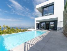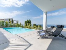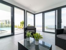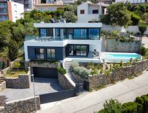 5 -sobna vila 145 m2 na 2 etaže, prema jugozapadu. Prostrano i svijetlo, komforno i luksuzno uređena: donji kat: 1 soba s 1 franc. krevetom (160 cm, dužina 200 cm), klima uređajem, grijanjem na topli zrak i električnim roletnama. Izlaz na terasu. 1 soba s 1 franc. krevetom (160 cm, dužina 200 cm), tušem/WC-om, klima uređajem, grijanjem na topli zrak i električnim roletnama. Izlaz na terasu. 1 soba s 1 x 2 kreveta na kat (90 cm, dužina 190 cm), klima uređajem, grijanjem na topli zrak i električnim roletnama. Tuš/WC. Gornji kat: dnevni boravak/blagovaona s stolom za blagovanje, TV-om sa sat. prijemnikom i digitalnim TV (plosnatim TV ekranom), klima uređajem, grijanjem na topli zrak i električnim roletnama. Izlaz na terasu, na bazen. 1 soba s 1 franc. krevetom (150 cm, dužina 190 cm), klima uređajem, grijanjem na topli zrak i električnim roletnama. Velika, otvorena kuhinja (pećnica, perilica za suđe, 3 Indukcione ploče, toster, kuhalo za vodu, mikrovalna pećnica, zamrzivač, el. aparat za kavu, kuhinjski otok). Kada/WC. Velika terasa, prema jugu. Garnitura za sjedenje. Prekrasan panoramski pogled na more. Na raspolaganju: perilica za rublje, sušilica, glačalo, dječji krevetić, sušilo za kosu. Garaža. Dodatna informacija: TV samo ES, FR. Groups of young people and of 8 adults not allowed. Mountainous loc.: sometimes there is little water pressure. There is a water pump installed in the house. R00000001- Aktivnosti u blizini
