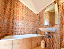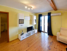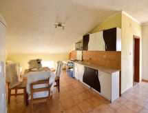 3 -sobni apartman 80 m2 na 1. katu, prema jugozapadu. Dnevni boravak/blagovaona 24 m2, s kosim stropom, visina stropa 120 - 250 cm s TV-om sa sat. prijemnikom (plosnatim TV ekranom), klima uređajem. Izlaz na terasu. 1 soba s 1 bračnim krevetom (2 x 90 cm, dužina 200 cm). 1 soba s kosim stropom, visina stropa 120 - 250 cm s 2 kreveta (90 cm, dužina 200 cm). S kosim stropom, otvorena kuhinja (4 ploče za kuhanje, pećnica, zamrzivač, el. aparat za kavu), visina stropa 120 - 250 cm. Kada/WC. Terasa 40 m2, terasa 16 m2. Garnitura za sjedenje. Pogled u daljini na more. Na raspolaganju: Internet (wireless LAN [WLAN], besplatan). 1 mali kućni ljubimac / pas dozvoljen.- postrojenja