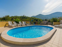 Mihelići 5 km od mjesta Opatija: Lijepa kuća s 3 apartmana "Kate". Iznad mjesta Opatija, u zaseoku Mihelici 5 km od centra mjesta Opatija, mirno, sunčano mjesto, 5 km od mora, 5 km od plaže, uz cestu, u zelenom. Za zajedničko korištenje: parcela 1'400 m2, njegovani vrt - travnjak i cvijeće, bazen (23 m2, 150 cm dubok, sezonska dostupnost: 15.May. - 15.Sep.). Sjenica (26 m2), vrtna garnitura za sjedenje, roštilj (ljuljačka). U kući: pristup internetu, trampolin. Parking uz kuću na parceli. Trgovina 2 km, restoran 300 m, šljunčana plaža 5 km, kupalište 6 km, betonirana plaža 5 km. Tenis 1 km. Dodatna informacija: Mogućnost rezerviranja dodatnih smještajnih jedinica. Ovalni bazen.Interior