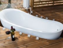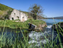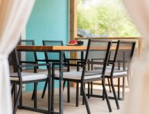 3 -sobni bungalov 31 m2. Dnevni boravak/blagovaona s TV-om sa sat. prijemnikom (plosnatim TV ekranom), klima uređajem. Izlaz na terasu. 1 soba s 1 franc. krevetom (160 cm, dužina 200 cm). 1 soba s 2 kreveta (80 cm, dužina 200 cm). Otvorena kuhinja (2 ploče za kuhanje, mikrovalna pećnica, zamrzivač, el. aparat za kavu). Tuš/bidet/WC. Grijanje toplim zrakom. Terasa 32 m2 (natkrita). Garnitura za sjedenje, ležaljke. Pogled na vrt. Na raspolaganju: dječji krevetić (uz doplatu), sušilo za kosu. Internet (wireless LAN [WLAN], besplatan). Parking (natkrit, 1 automobil) na 15 m. 1 mali kućni ljubimac / pas dozvoljen.- postrojenja