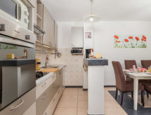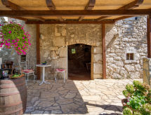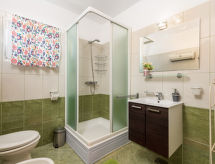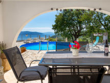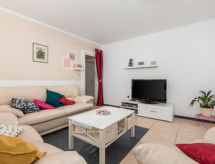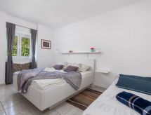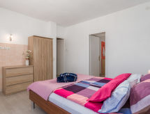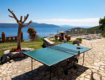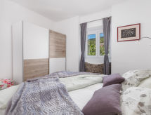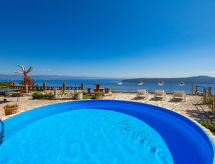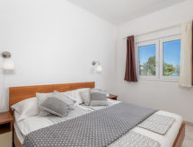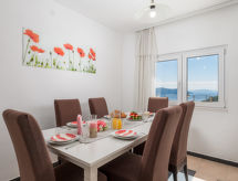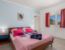 4 -sobna polovica dvojne kuće 90 m2, prema jugu. Lijepo uređena: dnevni boravak/blagovaona 24 m2 s TV-om (plosnatim TV ekranom), klima uređajem. Izlaz na terasu. 1 soba s 1 krevetom (90 cm, dužina 200 cm), 1 franc. krevetom (160 cm, dužina 200 cm). Prolazna soba s 1 franc. krevetom (160 cm, dužina 200 cm), tušem/bidetom/WC-om i klima uređajem. Izlaz na terasu. 1 soba s 1 franc. krevetom (160 cm, dužina 200 cm). Otvorena kuhinja (4 ploče za kuhanje, pećnica, perilica za suđe, mikrovalna pećnica, zamrzivač). Izlaz na terasu. Tuš/WC. Terasa 14 m2 (natkrita), terasa 10 m2. Garnitura za sjedenje. Prekrasan panoramski pogled na more. Na raspolaganju: perilica za rublje, sef, dječji krevetić. Internet (wireless LAN [WLAN], besplatan).- postrojenja