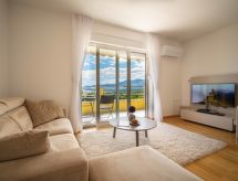 2 -sobni apartman 60 m2 na 1. katu, prema jugu. Lijepo i moderno uređen: dnevni boravak/blagovaona s 1 kaučem za 2 osobe (140 cm, dužina 190 cm), TV-om sa sat. prijemnikom i klima uređajem. Izlaz na balkon. 1 soba s 1 franc. krevetom (180 cm, dužina 200 cm), TV-om. Otvorena kuhinja (pećnica, perilica za suđe, 4 Indukcione ploče, kuhalo za vodu, zamrzivač, el. aparat za kavu). Tuš/bidet/WC. Grijanje. Balkon 7 m2. Balkonski namještaj. Pogled na more i krajolik. Na raspolaganju: perilica za rublje, sef, dječji krevetić, sušilo za kosu. Internet (wireless LAN [WLAN], besplatan). Dodatna informacija: vlastiti ulaz. Grijanje dostupno samo u periodu 01.10.-31.05. (uključeno u cijenu).- postrojenja