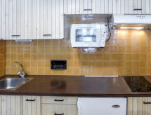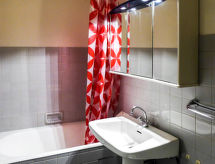 1 -sobni apartman 23 m2 na 5. katu, prema jugozapadu. Vrlo jednostavno uređen: dnevni boravak/blagovaona s panoramskim prozorom s 1 kaučem za 2 osobe (120 cm, dužina 190 cm), TV-om. Kuhinjska niša (2 ploče za kuhanje, mini pećnica, kuhalo za vodu, el. aparat za kavu). Kada/WC. Lijep pogled na planine. Na raspolaganju: Internet (wireless LAN [WLAN], uz doplatu). Parking br. 58. Dodatna informacija: TV samo FR. Protupožarni alarm.- Značajke smještaja