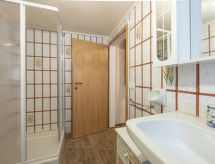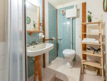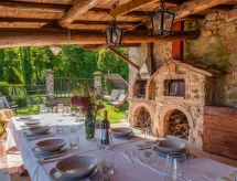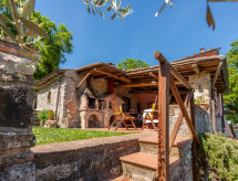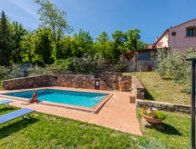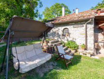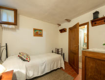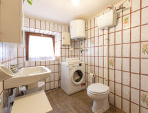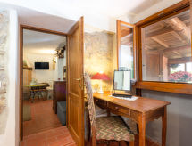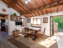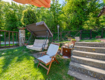 4 -sobna polovica dvojne kuće 100 m2 na 2 etaže. Komforno i rustikalno uređena: dnevno-spavaća soba s 1 kaučem za 2 osobe, otvorenim kaminom i TV-om sa sat. prijemnikom. 1 otvorena mala soba s 1 krevetom (80 cm), tušem/WC-om. 1 soba s 1 bračnim krevetom. Otvorena kuhinja (pećnica, perilica za suđe, 4 plamena za kuhanje, toster, kuhalo za vodu, zamrzivač, el. aparat za kavu) s stolom za blagovanje i peći na drva. Izlaz na terasu. Grijanje samo u pojedinim prostorijama. Gornji kat: (vanjske stepenice) dnevno-spavaća soba s 1 kaučem za 2 osobe, otvorenim kaminom i stolom za blagovanje. Izlaz na terasu. 1 soba s 1 x 2 kreveta na kat (80 cm), 1 bračnim krevetom. Kuhinja (4 Indukcione ploče, zamrzivač). Tuš/bidet/WC. Grijanje na drva. Grijanje samo u pojedinim prostorijama. Prirodni kameni pod. Terasa (natkrita). Vrtni roštilj, ležaljke (4). Panoramski pogled. Na raspolaganju: perilica za rublje, glačalo, visoka dječja stolica, dječji krevetić. Internet (wireless LAN [WLAN], besplatan). Dodatna informacija: apartman za nepušače. Najviše 3 kućna ljubimca / psa dozvoljena. Katovi nisu interno povezani.- postrojenja