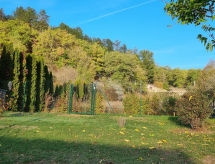 4 -sobna kuća 98 m2. Komforno i lijepo uređena: dnevni boravak/blagovaona s TV-om (plosnatim TV ekranom), DVD-om. 1 soba s 1 krevetom (90 cm), umivaonikom i tušem. 1 soba s 2 kreveta (80 cm, dužina 190 cm), umivaonikom i tušem. 1 soba s 2 kreveta (90 cm), 1 franc. krevetom (140 cm), kadom/WC-om. Otvorena kuhinja (4 ploče za kuhanje, pećnica, perilica za suđe, mikrovalna pećnica, zamrzivač) s barom. Odv. WC. El. grijanje. Terasa 20 m2, vrt. Garnitura za sjedenje, vrtni roštilj, ležaljke. Pogled na dolinu. Na raspolaganju: perilica za rublje, dječji krevetić do 2 godine. Internet (wireless LAN [WLAN], besplatan). Parking. Dodatna informacija: prikladno za obitelji. 1 kućni ljubimac / pas dozvoljen. Protupožarni alarm.- Značajke smještaja