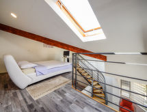 1 -sobna polovica dvojne kuće 45 m2 na 2 etaže. Dnevni boravak/blagovaona s 1 kaučem za 2 osobe (160 cm, dužina 210 cm), TV-om sa sat. prijemnikom (plosnatim TV ekranom), muzičkom linijom i klima uređajem. Otvorena kuhinja (pećnica, 4 staklokeramičke ploče za kuhanje, mikrovalna pećnica, el. aparat za kavu). Tuš/WC, hidromasažnim tušem. Grijanje toplim zrakom (uz doplatu). Potkrovlje s kosim stropom, otvorena galerija, visina stropa 110 - 235 cm s krovnim prozorom s 1 franc. krevetom (180 cm, dužina 200 cm), TV-om sa sat. prijemnikom (plosnatim TV ekranom). Ležaljke. Na raspolaganju: sef. Internet (wireless LAN [WLAN], besplatan).- postrojenja