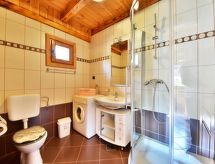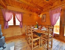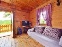 3 -sobni chalet 80 m2 na 2 etaže, prema jugu. S puno drva uređen: dnevni boravak/blagovaona 35 m2 s 1 kaučem za 1 osobu (140 cm, dužina 200 cm), TV-om sa sat. prijemnikom (plosnatim TV ekranom), peći na drva. Izlaz na balkon. Otvorena kuhinja (pećnica, perilica za suđe, 4 staklokeramičke ploče za kuhanje, el. aparat za kavu). Tuš/WC. Potkrovlje (kružne stepenice) 1 soba s kosim stropom, visina stropa 120 - 255 cm s 1 franc. krevetom (140 cm, dužina 200 cm). Izlaz na balkon. 1 soba s kosim stropom, visina stropa 120 - 255 cm s 1 franc. krevetom (180 cm, dužina 200 cm). Izlaz na balkon. Odv. WC. Grijanje na drva. Balkon 6 m2, 2 balkona 4 m2, terasa 10 m2 (natkrita). Garnitura za sjedenje. Pogled na krajolik. Na raspolaganju: drvo (uklj.). Internet (wireless LAN [WLAN], besplatan). 1 kućni ljubimac / pas dozvoljen.- postrojenja
