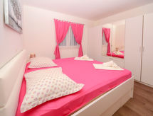 5 -sobna polovica dvojne kuće 120 m2 na 2 etaže, prema jugu. Dnevni boravak/blagovaona s TV-om sa sat. prijemnikom (plosnatim TV ekranom), klima uređajem. Izlaz na terasu. 1 soba s 1 bračnim krevetom (2 x 80 cm, dužina 200 cm). 1 soba s 1 franc. krevetom (160 cm, dužina 200 cm). Otvorena kuhinja (4 ploče za kuhanje, pećnica, perilica za suđe, zamrzivač, el. aparat za kavu). Tuš/WC. Gornji kat: s kosim stropom, otvorena galerija, visina stropa 60 - 250 cm s krovnim prozorom s TV-om sa sat. prijemnikom (plosnatim TV ekranom). 1 soba s kosim stropom, visina stropa 60 - 250 cm s krovnim prozorom s 2 kreveta (90 cm, dužina 200 cm). 1 soba s kosim stropom, visina stropa 60 - 250 cm s krovnim prozorom s 1 franc. krevetom (160 cm, dužina 200 cm). Odv. WC. Terasa 20 m2. Garnitura za sjedenje. Prekrasan pogled na more. Na raspolaganju: visoka dječja stolica, dječji krevetić, sušilo za kosu. Internet (wireless LAN [WLAN], besplatan). Dodatna informacija: protupožarni alarm, vatrogasni aparat.- postrojenja