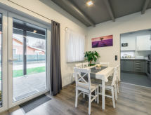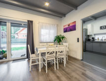 Moderna obiteljska kuća "Lavendel", godina izgradnje 2020. U samom mjestu 400 m od centra mjesta Sosto, 5 km od centra mjesta Siofok, sunčano mjesto u jednoj četvrti za stanovanje, 500 m od jezera. Za samostalno korištenje: parcela 480 m2 (ograđena) - travnjak i drveće, travnjak za sunčanje. U kući: wireless LAN [WLAN], perilica za rublje. Parking na parceli. Trgovina 400 m, supermarket 1.2 km, plaža s travom 500 m. Biciklistička staza 200 m. Objekt pogodan za 4 odraslih + 2 djece. Vlasnik ne prihvaća grupe mladih.Interior