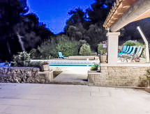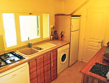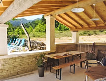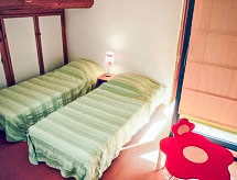 5 -sobna kuća 80 m2 na 2 etaže. Svrsishodno uređena: salon 25 m2 s otvorenim kaminom i TV-om. Izlaz na terasu. Blagovaona. Kuhinja (4 ploče za kuhanje, pećnica, perilica za suđe, zamrzivač). Tuš/WC. Gornji kat: 1 soba s kosim stropom s 2 kreveta (80 cm). 2 sobe, svaka soba s 1 franc. krevetom. Tuš/WC. El. grijanje. Terasa 50 m2 (djelomično natkrita). Garnitura za sjedenje, vrtni roštilj. Pogled na. Na raspolaganju: perilica za rublje, visoka dječja stolica, dječji krevetić. Internet (wireless LAN [WLAN], besplatan). 1 kućni ljubimac / pas dozvoljen.- postrojenja