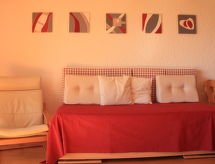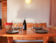 "Le Bouquetin 5", 2 -sobni apartman 53 m2 na 1. katu, prema jugu. Svrsishodno i komforno uređen: dnevni boravak/blagovaona s 2 kreveta na izvlačenje (2 osobe 2 x 90 cm), otvorenim kaminom, stolom za blagovanje i TV-om (plosnatim TV ekranom). Izlaz na balkon, prema jugu i prema istoku. 1 soba s 2 kreveta (90 cm), kadom/WC-om. Otvorena kuhinja (pećnica, perilica za suđe, 4 staklokeramičke ploče za kuhanje, mikrovalna pećnica, el. aparat za kavu, Doze za mašinu za kavu (Nespresso) uz doplatu). Tuš/WC. Mali balkon, prema jugu i prema istoku. Vrlo lijep panoramski pogled na planine. Garaža br. N°5 (1 automobil). Dodatna informacija: apartman za nepušače. Nema dizala.- Značajke smještaja