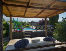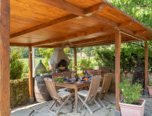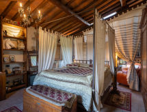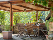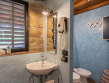 4 -sobna polovica dvojne kuće 130 m2 na 3 etaže. Rustikalno uređena: dnevni boravak/blagovaona s stolom za blagovanje, TV-om sa sat. prijemnikom, muzičkom linijom i DVD-om. Gornji kat: dnevni boravak s TV-om sa sat. prijemnikom. Otvoreni polukat s 1 franc. krevetom (160 cm), TV-om sa sat. prijemnikom. Otvorena kuhinja (pećnica, perilica za suđe, 4 plamena za kuhanje, toster, mikrovalna pećnica, zamrzivač, el. aparat za kavu) s stolom za blagovanje. 2 x tuš/WC. 2. Gornji kat: 1 otvorena soba s kosim stropom s 2 kreveta (80 cm), 1 franc. krevetom (160 cm), TV-om sa sat. prijemnikom. Grijanje na plin. Drveni pod, prirodni kameni pod. Vrtna terasa, travnjak 5'000 m2, sjenica. Vrtni roštilj. Na raspolaganju: perilica za rublje, visoka dječja stolica, dječji krevetić do 2 godine. Internet (wireless LAN [WLAN], besplatan). Parking (ograđen, 2 automobila) uz kuću. Dodatna informacija: kuća za nepušače. 1 kućni ljubimac / pas dozvoljen.- postrojenja