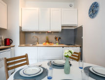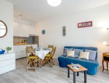 "Le Dolmen", 2 -sobni apartman 34 m2, u prizemlju. Objekt pogodan za 2 odraslih + 2 djece. Djelomično renoviran godine 2021, lijepo uređen: dnevni boravak/blagovaona s 1 kaučem za 2 osobe (1 x 140 cm, dužina 190 cm), TV-om (plosnatim TV ekranom). Izlaz na terasu. 1 soba s 2 kreveta (80 cm, dužina 190 cm). Kuhinjska niša (pećnica, 2 staklokeramičke ploče za kuhanje, el. aparat za kavu). Kada, odv. WC. El. grijanje. Mala terasa 6 m2. Garnitura za sjedenje. Pogled na vrt. Na raspolaganju: perilica za rublje, glačalo, sušilo za kosu. Internet (wireless LAN [WLAN], besplatan). Parking (1 automobil). Dodatna informacija: apartman za nepušače.- postrojenja