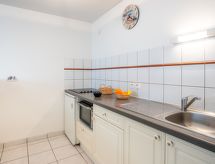 2 -sobni apartman 45 m2. Komforno uređen: dnevni boravak/blagovaona s panoramskim prozorom s 1 kaučem za 2 osobe (1 x 140 cm, dužina 190 cm), TV-om (plosnatim TV ekranom). Izlaz na terasu. 1 soba s 1 franc. krevetom (1 x 140 cm, dužina 190 cm). Kuhinja (pećnica, 4 staklokeramičke ploče za kuhanje, el. aparat za kavu, kombinirana mikrovalna pećnica). Kada, odv. WC. El. grijanje. Velika terasa 13 m2. Garnitura za sjedenje. Na raspolaganju: perilica za rublje. Internet (wireless LAN [WLAN], besplatan). Garaža (1 automobil). Dodatna informacija: 1 kućni ljubimac / pas dozvoljen. Protupožarni alarm.- Značajke smještaja
