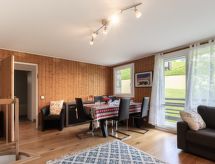 "Le Nerey", 3 -sobni apartman 67 m2 na 2 etaže, u povišenom prizemlju. Renoviran godine 2016, komforno uređen: dnevni boravak/blagovaona s 1 kaučem za 1 osobu (140 cm), stolom za blagovanje i TV-om (plosnatim TV ekranom). Izlaz na balkon. 1 soba s 1 franc. krevetom (160 cm). Otvorena kuhinja (4 ploče za kuhanje, pećnica, perilica za suđe, 4 Indukcione ploče, toster, kuhalo za vodu, zamrzivač, el. aparat za kavu, Doze za mašinu za kavu (nespresso), raclette roštilj, kombinirana mikrovalna pećnica). Kada, odv. WC. Grijanje na plin. Donji kat: (kružne stepenice) 1 soba s 1 x 2 kreveta na kat, 1 krevetom na izvlačenje (2 osobe), TV-om (plosnatim TV ekranom). Tuš/WC. Balkon, prema zapadu. Pogled na krajolik. Na raspolaganju: perilica za rublje, sušilica. Internet (wireless LAN [WLAN], besplatan). Garaža. Dodatna informacija: TV samo FR. Protupožarni alarm.- Značajke smještaja