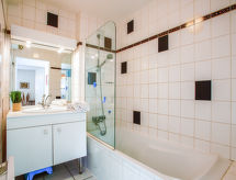 4 -sobni apartman 60 m2 na 2 etaže, u prizemlju, prema jugu. Komforno uređen: dnevni boravak/blagovaona s TV-om (plosnatim TV ekranom). Izlaz na terasu. 1 soba s 2 kreveta (80 cm, dužina 190 cm). Kuhinjska niša (pećnica, perilica za suđe, 4 staklokeramičke ploče za kuhanje, mikrovalna pećnica, el. aparat za kavu). Kada, odv. WC. Gornji kat: 1 soba s 1 franc. krevetom (140 cm, dužina 190 cm). 1 soba s 1 krevetom (90 cm, dužina 190 cm). Tuš, odv. WC. El. grijanje. Terasa 10 m2. Garnitura za sjedenje, ležaljke (2). Na raspolaganju: perilica za rublje, dječji krevetić. Internet (wireless LAN [WLAN], besplatan). Parking br. 5. Dodatna informacija: TV samo FR. Protupožarni alarm.- Aktivnosti u blizini