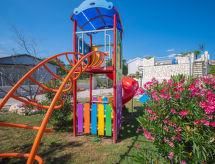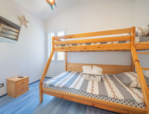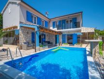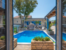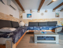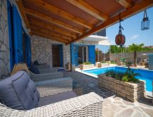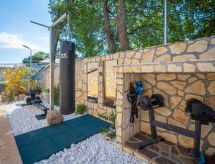5 -sobna vila 170 m2 na 2 etaže. Dnevni boravak/blagovaona 48 m2 s TV-om sa sat. prijemnikom (plosnatim TV ekranom), klima uređajem. Izlaz na terasu, na bazen. 1 soba s 1 bračnim krevetom (2 x 90 cm, dužina 200 cm), kadom/bidetom/WC-om i TV-om sa sat. prijemnikom (plosnatim TV ekranom), klima uređajem. Izlaz na terasu, na bazen. Otvorena kuhinja (pećnica, perilica za suđe, 4 staklokeramičke ploče za kuhanje, mikrovalna pećnica, zamrzivač). Gornji kat: 1 soba s 1 bračnim krevetom (2 x 90 cm, dužina 200 cm), tušem/WC-om i TV-om sa sat. prijemnikom (plosnatim TV ekranom), klima uređajem. 1 soba s 1 bračnim krevetom (2 x 90 cm, dužina 200 cm), tušem/WC-om i TV-om sa sat. prijemnikom (plosnatim TV ekranom), klima uređajem. Izlaz na balkon. 1 dječja soba s 1 franc. krevetom (140 cm, dužina 200 cm), tušem/WC-om i TV-om sa sat. prijemnikom (plosnatim TV ekranom), klima uređajem. Podno grijanje (uz doplatu). Balkon 5 m2, terasa 20 m2 (natkrita). Garnitura za sjedenje, ležaljke. Pogled na bazen. Na raspolaganju: dječji krevetić. Internet (wireless LAN [WLAN], besplatan).- Aktivnosti u blizini